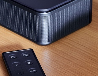 • Bluetooth接続に対応。聴きたい曲をいつでも好きなだけ楽しめます。専用リモコンの「Bluetooth」ボタンを押すと、対応機器とペアリングして音楽やポッドキャストなどをワイヤレスで再生します。