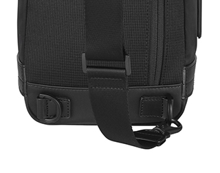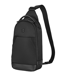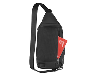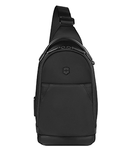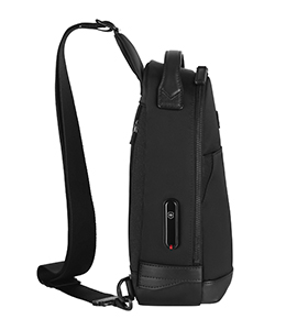 外観は艶のあるナイロン素材をベースに、ブラックレザーを使用して、洗練されたデザインに仕上げました。ビクトリノックスのロゴマークもマットブラックのメタルパーツを使用し、クールで都会的なオールブラックのスリングバッグです。背面に隠しファスナーポケットがあり、パスポートなどの貴重品を収納でき、機能面も充実しています。