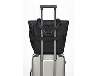 • 全モデルにはPC収納ポケットと、スーツケースの伸縮ハンドルにセットアップ可能なスリーブが付属。肩に掛けやすい自立するハンドル。