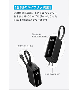 • USB急速充電器、モバイルバッテリーおよびUSB-Cケーブルが一体となった3-in-1のFusionシリーズ。