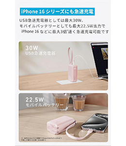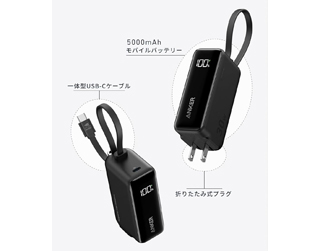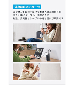 折りたたみ式プラグを採用し、コンセントに挿すだけで本体への充電が可能。またUSB-Cケーブル一体型のため、別途充電器とケーブルの持ち運びが不要です。