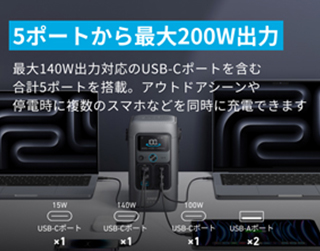 • USB-C、USB-Aを含む合計5ポートを搭載し、合計最大200W出力が可能です。キャンプ時に複数のスマホなどを充電することができ、ノートPCへの急速充電はもちろん、カメラやプロジェクター、ドローンなど様々な機器へ給電 / 充電できます。