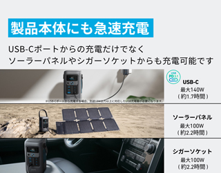 • USB-Cポート、ソーラーパネル、シガーソケットからの充電に対応し、多様な場面に合わせて充電方法をお選び頂けます。USB-Cポートからは最大140W入力で約1.7時間、最大100W出力のソーラーパネルを1つ接続で約2.2時間、シガーソケットを1つ接続で約2.2時間で満充電可能です。