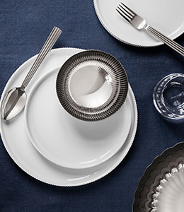 典型的なクラシックな上品さ、アールデコ調のラインは、テーブルにエレガンスを添えてくれます。 アールヌーヴォーをルーツとしたメゾン美学を、より合理化された機能主義的な方向へ向かわせたカトラリーのセット内容は、ディナースプーン(199mm)、ディナーフォーク(204mm)、ディナーナイフ(229mm)、ティースプーン(134mm)、各4本。 鏡面仕上げのステンレススティール製で、食洗機対応です。
