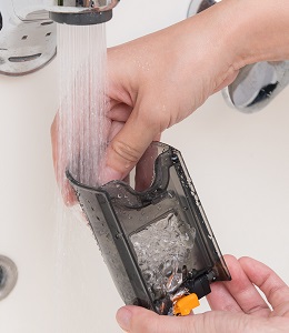 • ボタンを押すだけで、手で触れることなく ゴミを捨てることができるので衛生的です。 ダストカップは取り外して水洗いが可能。