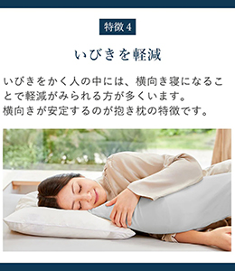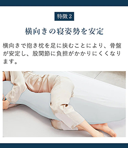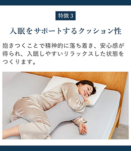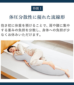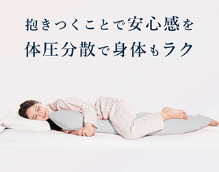 抱きつくことで安心感を、体圧分散で身体もラクに。抱き枕に体重を預けることで横向きの寝姿勢が安定し、肩や腰に集中する重みの負荷を分散して身体への負担が少なくお休みいただけます。